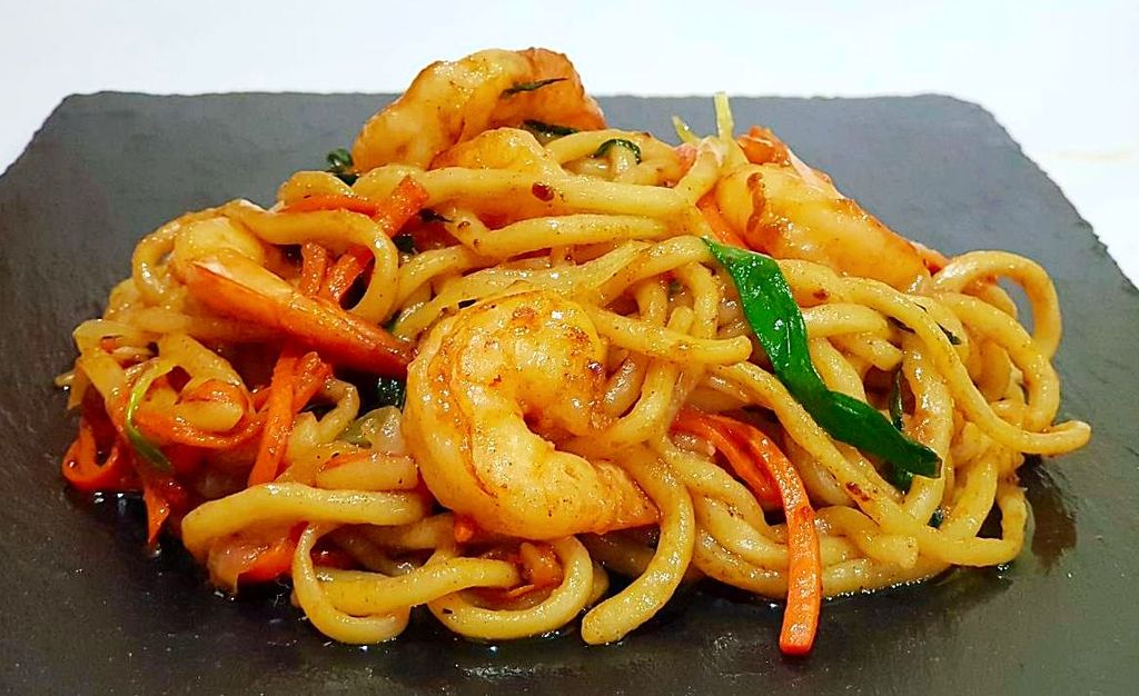 420 руб. В корзину Купить в 1 клик Описание лапша пшеничная креветка тигровая филе куриное свежие овощи(морковь,лук репчатый,лук зелёный,ростки сои) фирменный соус Вес:350 гр