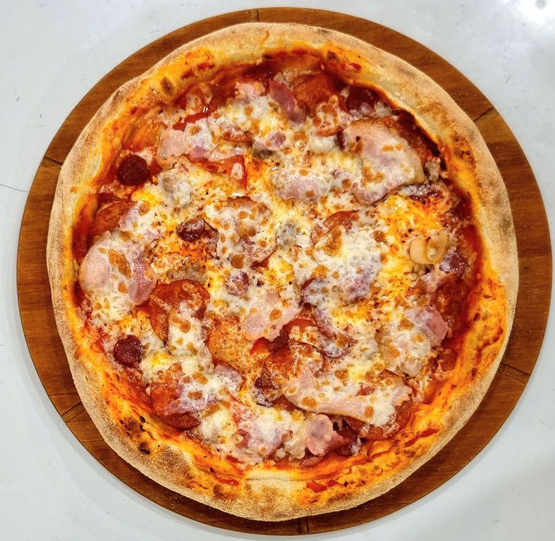 650 руб. В корзину Купить в 1 клик Описание традиционное тесто фирменный томатный соус пепперони колбаски охотничьи бекон свинина (фарш) томаты сыр моцарелла Размер:30 см С этим товаром покупаютВ корзинуКока Кола 1л180 ₽ В корзинуКОЛЬЦА ЛУКОВЫЕ В ПАНИРОВКЕ190 ₽ В корзинуУДОН С КУРИЦЕЙ340 ₽