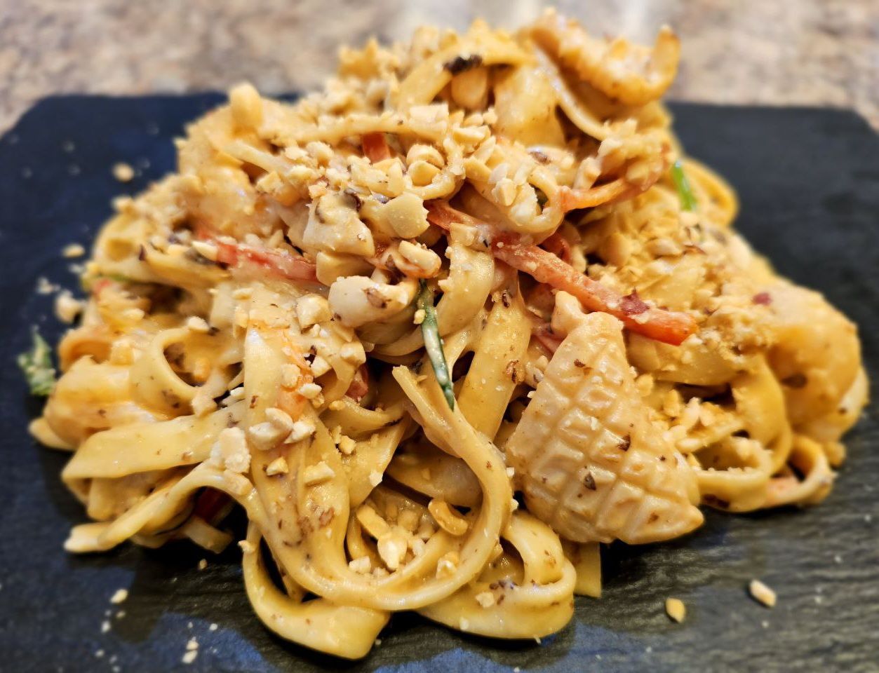 Лапша пшеничная с креветкой и кальмаром под особым сливочнымр соусом