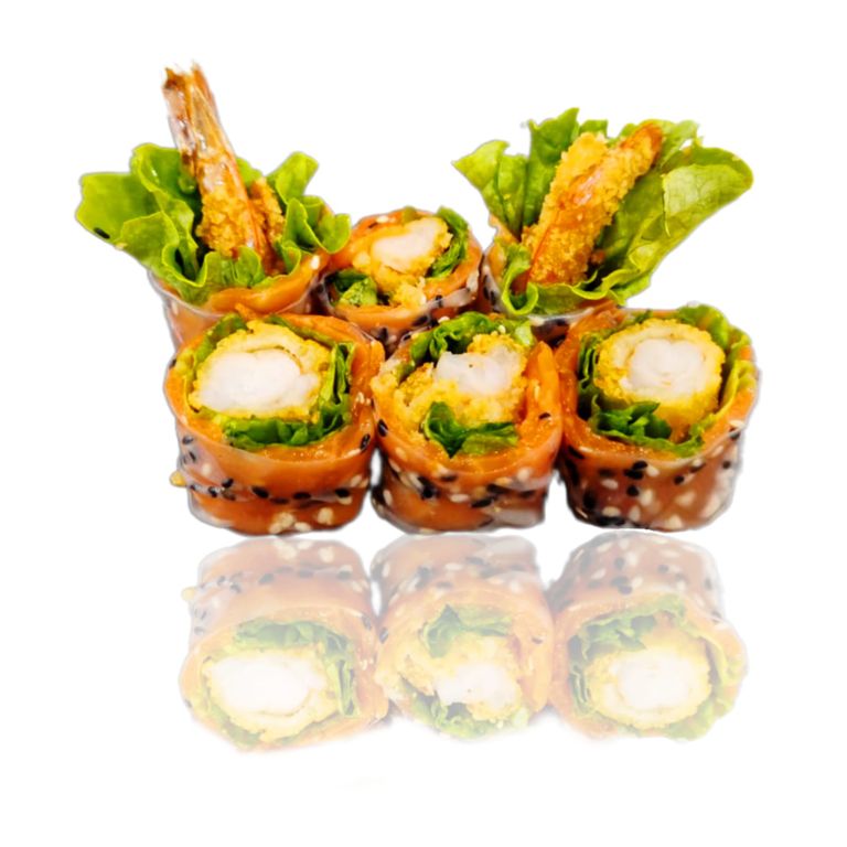 410 руб. В корзину Купить в 1 клик Рисовая бумага Сёмга слабо-солёная Креветка тигровая в панировке Лист салата Соус Спайси Кунжут Описание Ролл в рисовой бумаге Сёмга, Креветка в панировке Лист салата Соус Спайси Кунжут