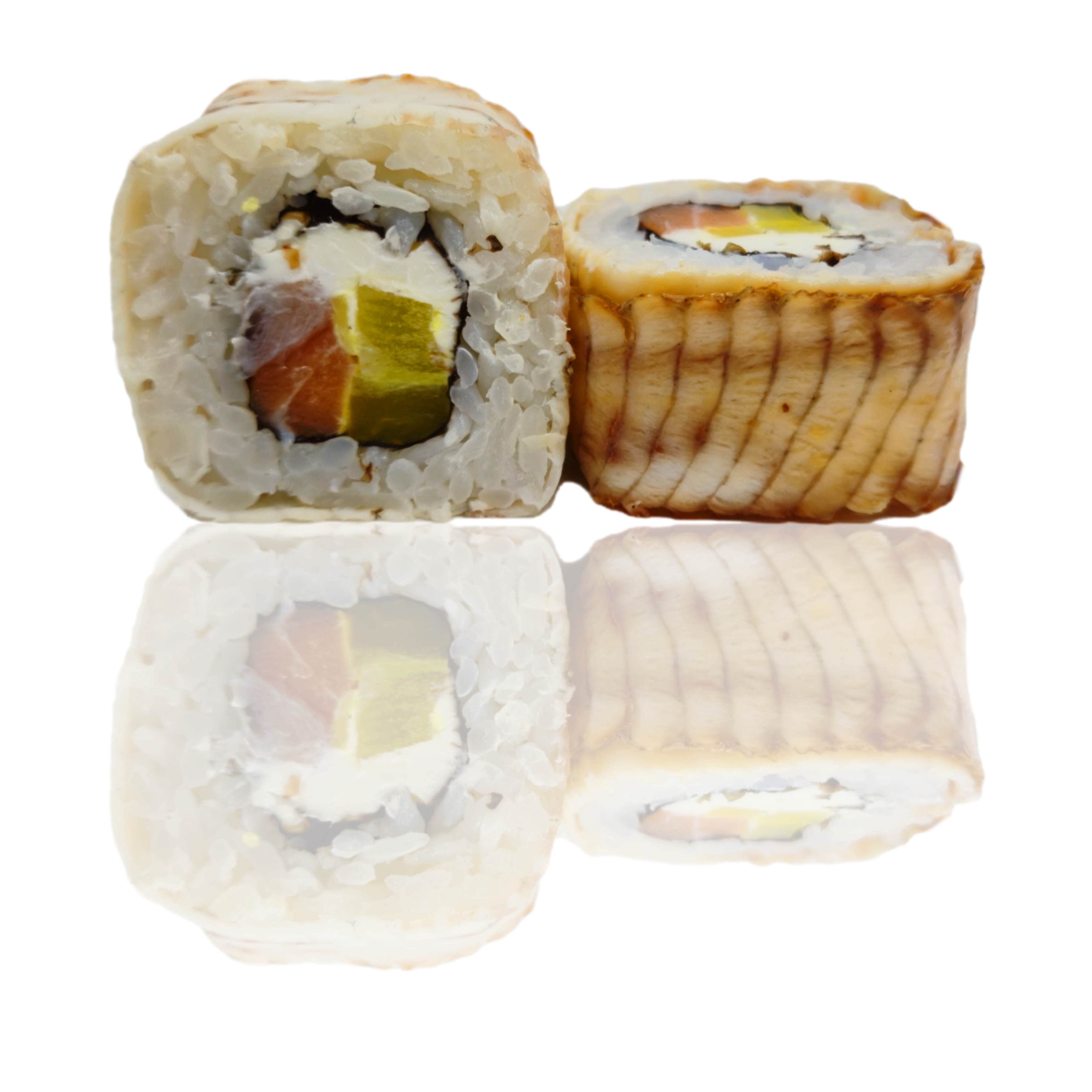 Ролл «Канада» — это изысканный урамаки-ролл с нежной начинкой из сливочного сыра, МАРИНОВАННОГО ДАЙКОНА,НЕЖНЕЙШЕГО ЛОСОСЯ, копченого угря и классического риса.Его утонченный вид подчеркивают ароматный соус унаги, который покрывает блюдо И СЕМЯ КУНЖУТА
